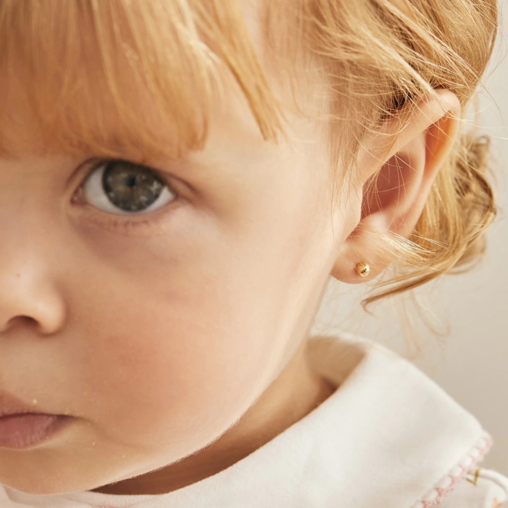 O brinco bolinha é produzido em ouro amarelo 18k, mede aproximadamente 3mm de diâmetro.