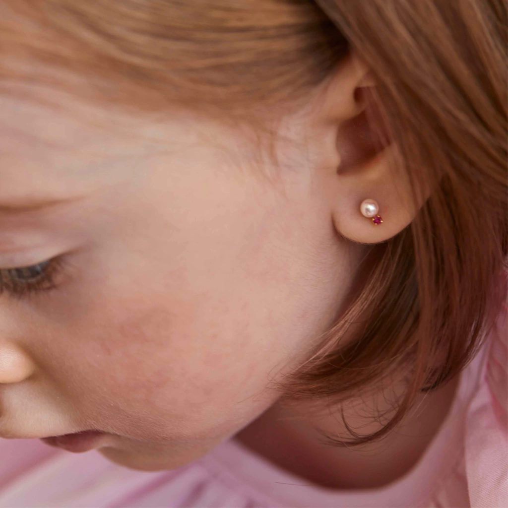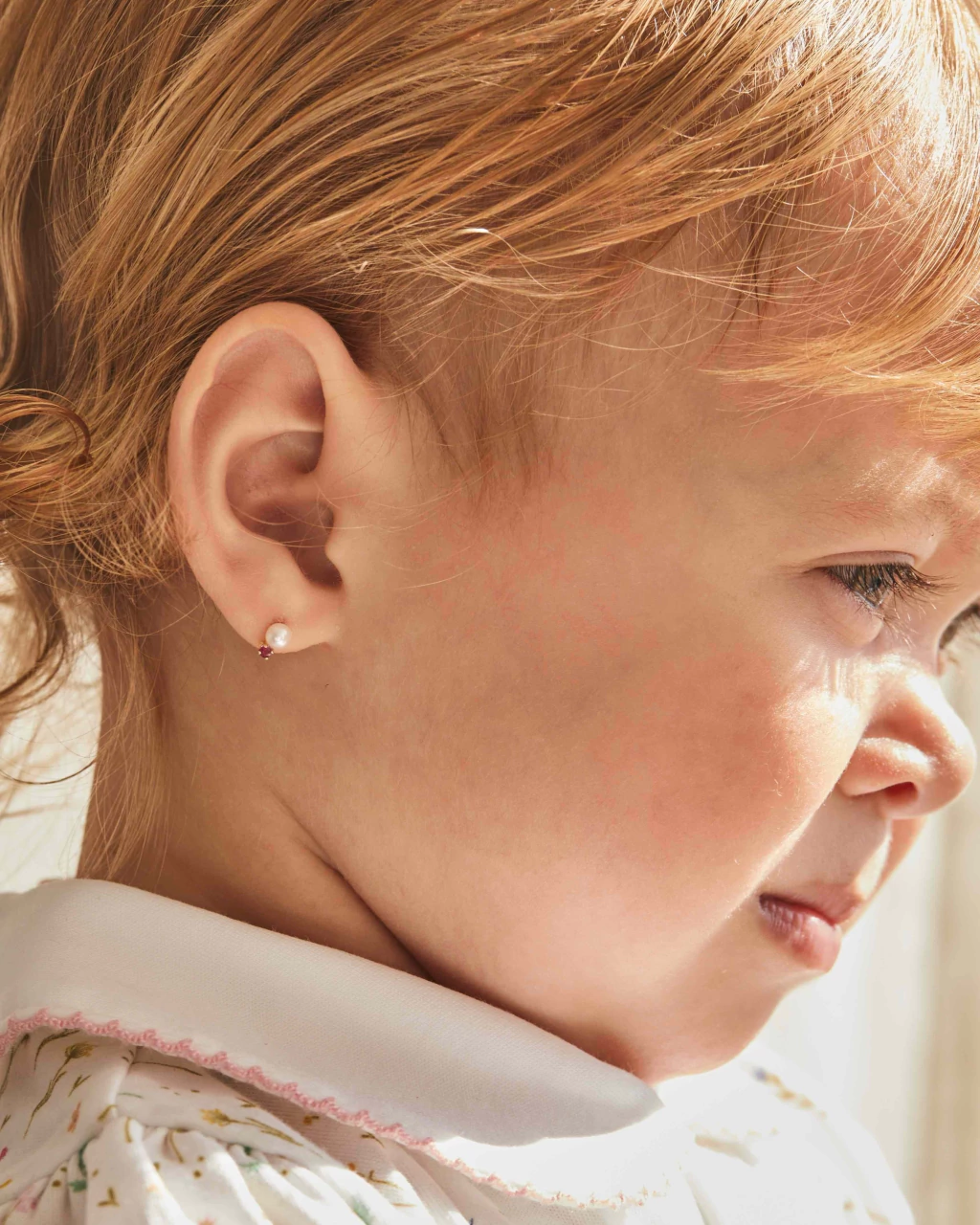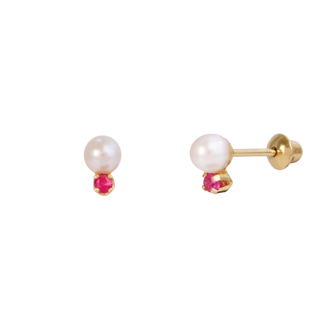 O brinco pérola e rubi é produzido em ouro amarelo 18k, mede aproximadamente 5,5 x 3,5mm e cada pé possui 1 pedra de rubi de 2mm e 1 pérola de 3,5mm cada.