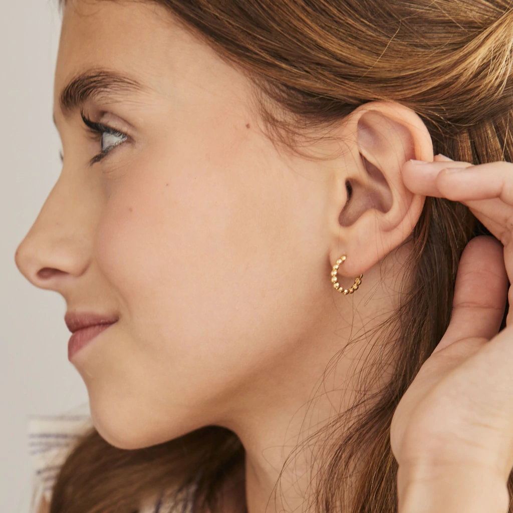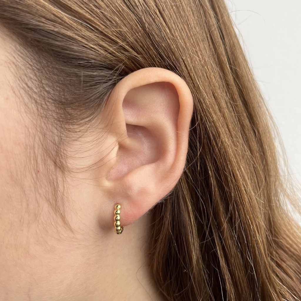 A argola bolinha é produzida em ouro amarelo e branco 18k, mede aproximadamente 12,5mm de diâmetro.