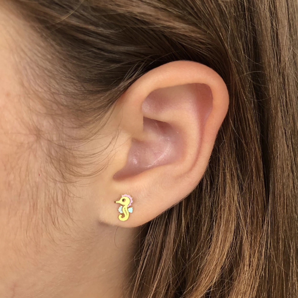 O brinco cavalo marinho é esmaltado e produzido em ouro amarelo 18k, mede aproximadamente 9,5 x 6 mm.