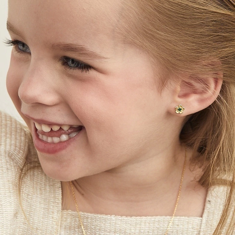 O brinco flor é produzido em ouro amarelo 18k e esmeralda, mede aproximadamente 6,5 mm e cada pé possui uma esmerada de 2 mm.
