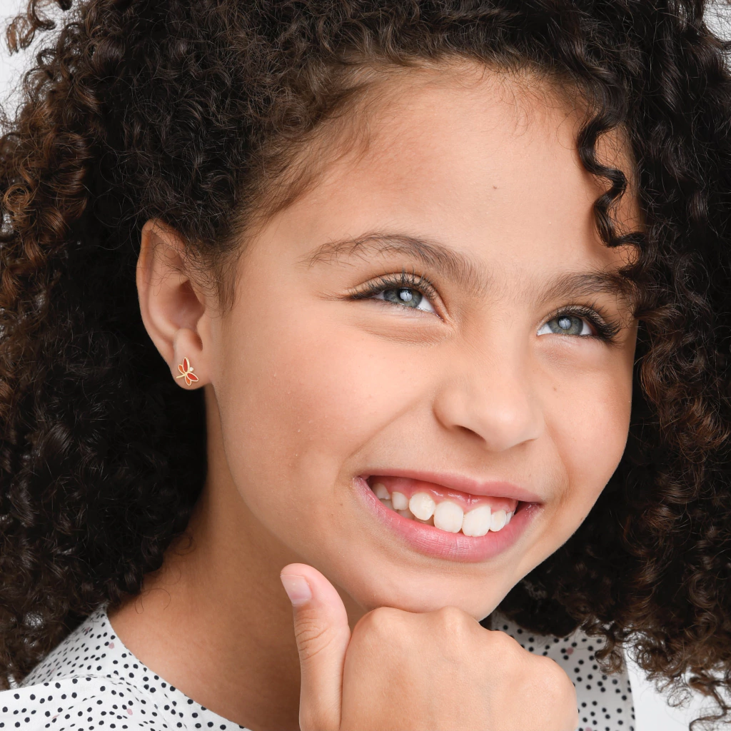 O brinco libélula é esmaltado e produzido em ouro amarelo 18k, mede aproximadamente 7 x 10mm e possui tarraxa vazada de silicone.
