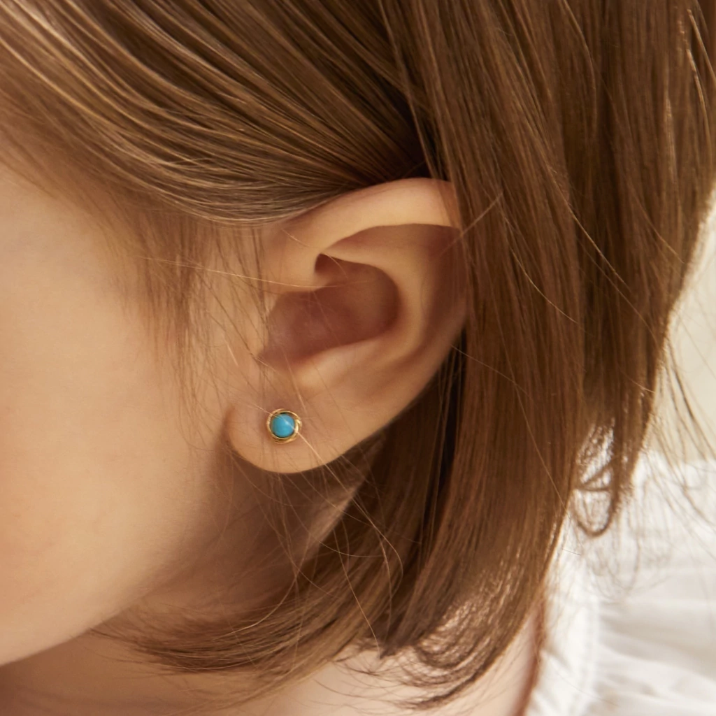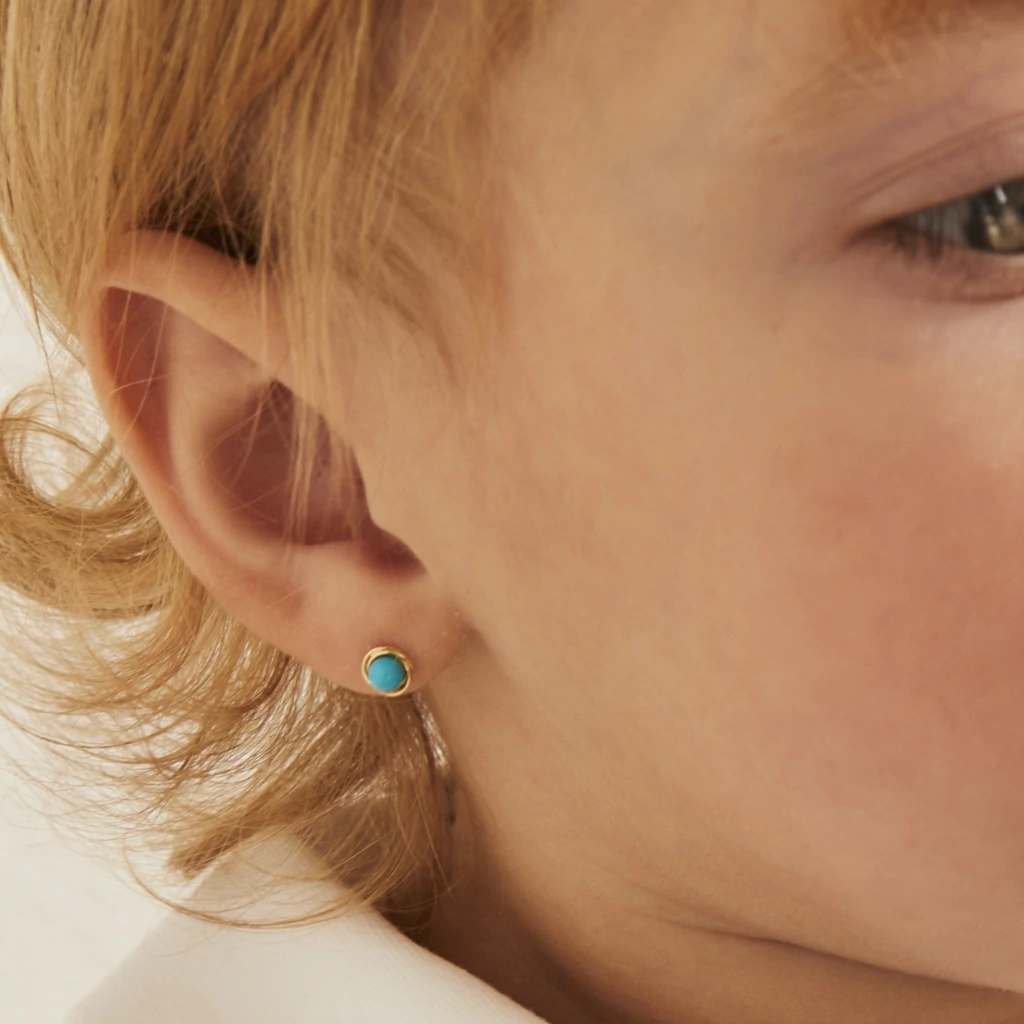 O brinco infantil turquesa é produzido em ouro amarelo 18k, mede aproximadamente 3,5 mm e no centro possui uma pedra turquesa de 3mm.