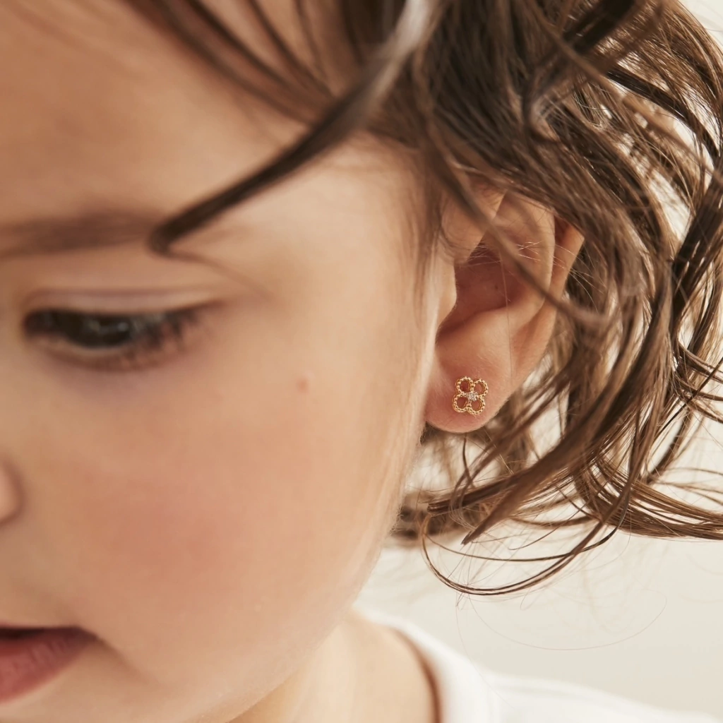 O brinco trevo é produzido em ouro amarelo e branco 18k, mede aproximadamente 6,5mm de diâmetro e cada pé possui um diamante no centro. Seu acabamento é todo feito com mini bolinhas.