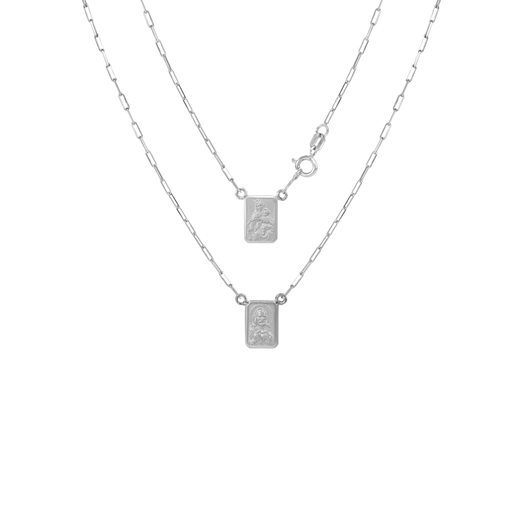 O escapulário é produzido em ouro branco18k, sua corrente Cartier mede aproximadamente 40 cm e cada medalha 9 x 6 mm. As duas plaquinhas são dupla face do Sagrado Coração de Jesus e Nossa Senhora do Carmo.