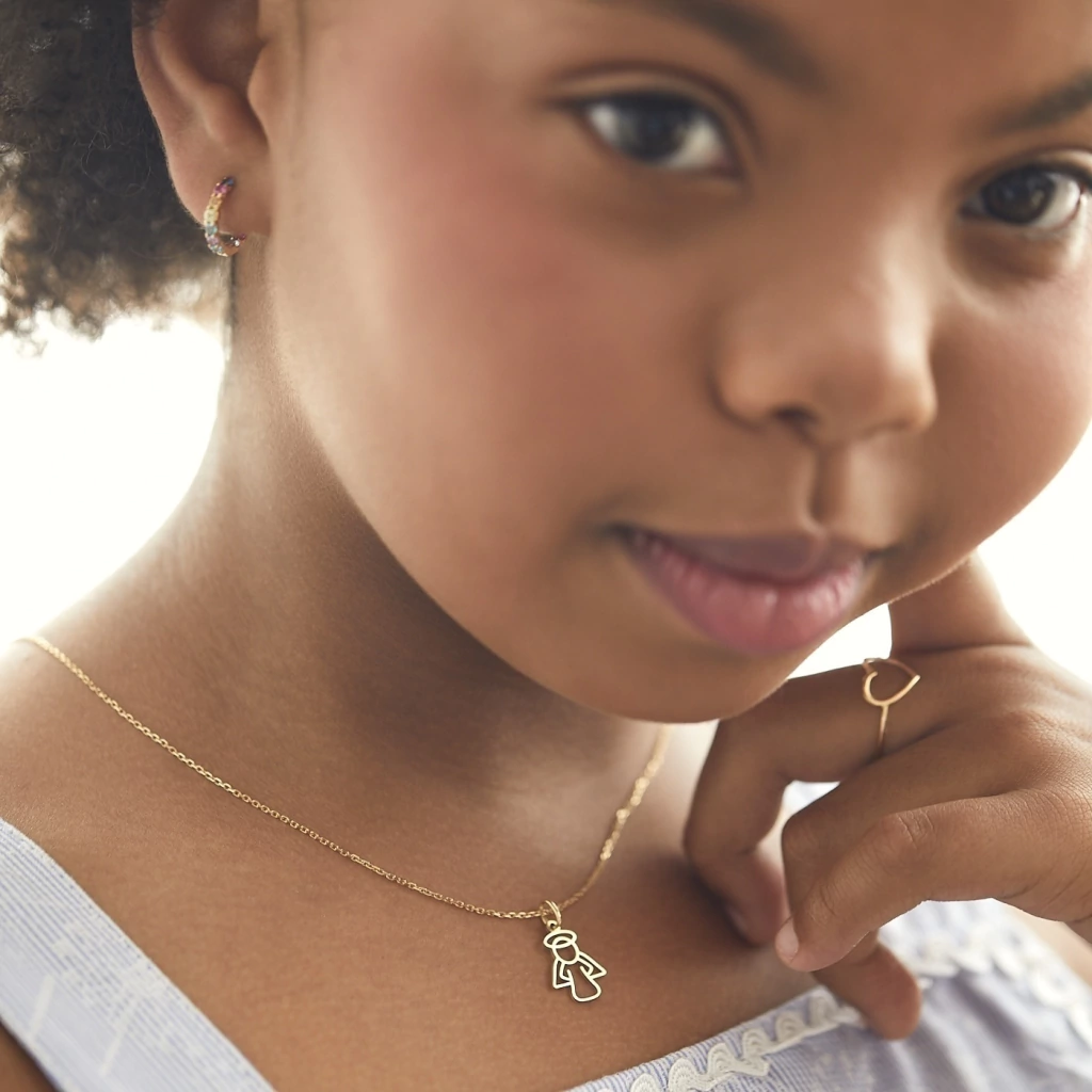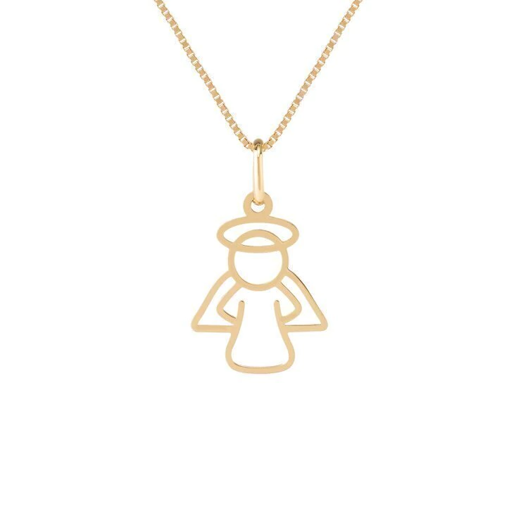 O pingente anjo é produzido em ouro amarelo 18k, mede aproximadamente 15 x 11 mm (sem considerar o elo).