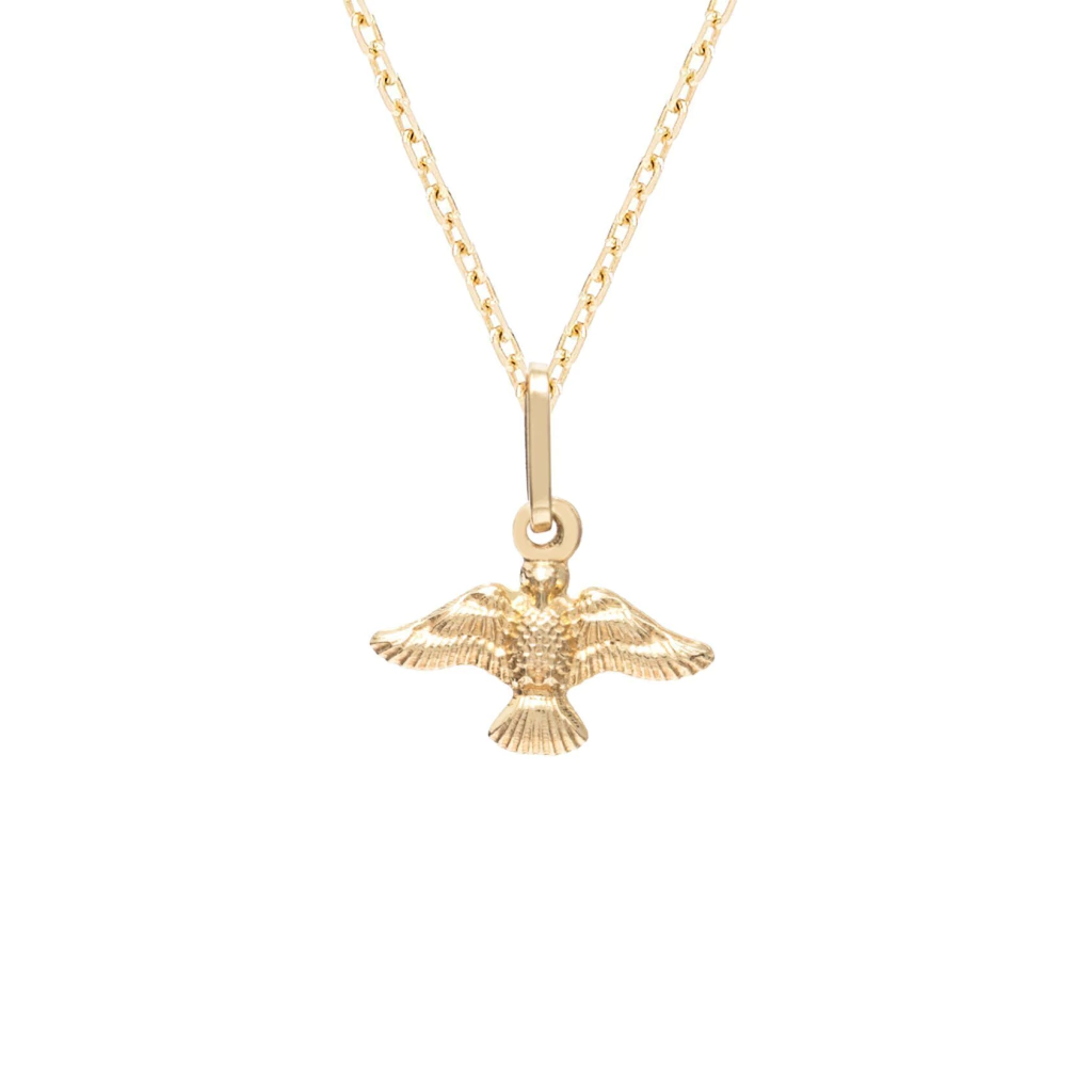O pingente Espírito Santo é produzido em ouro amarelo 18k, mede aproximadamente 9 x 12 mm (sem considerar o elo).