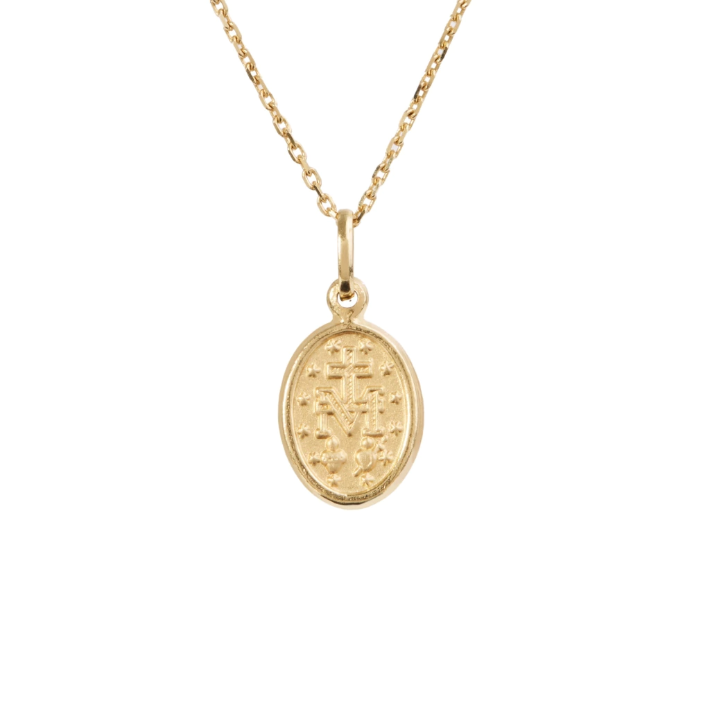 O pingente infantil Nossa Senhora Graças (Nossa Senhora Milagrosa) é produzido em ouro amarelo 18k, mede aproximadamente 13 x 8,5 mm (sem considerar o elo).
