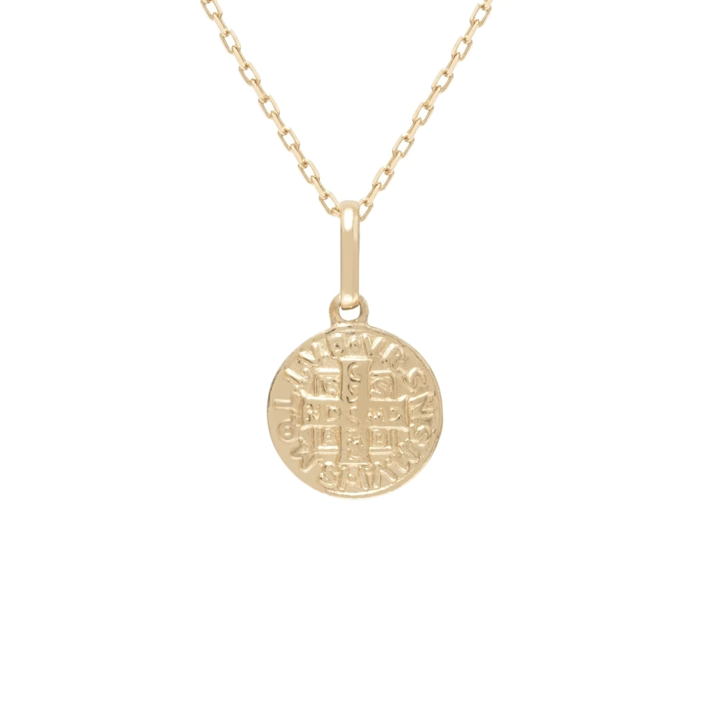 O pingente São Bento é produzido em ouro amarelo 18k, mede aproximadamente 9 mm (sem contar com o elo).