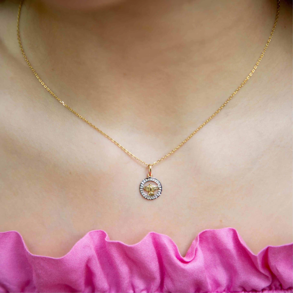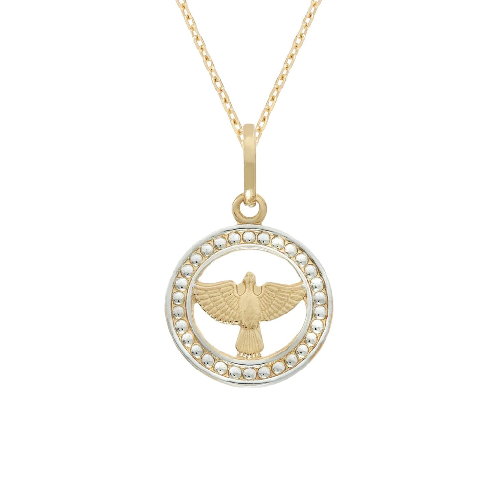 O pingente Espirito Santo é produzido em ouro amarelo e branco 18k, mede aproximadamente 11mm.