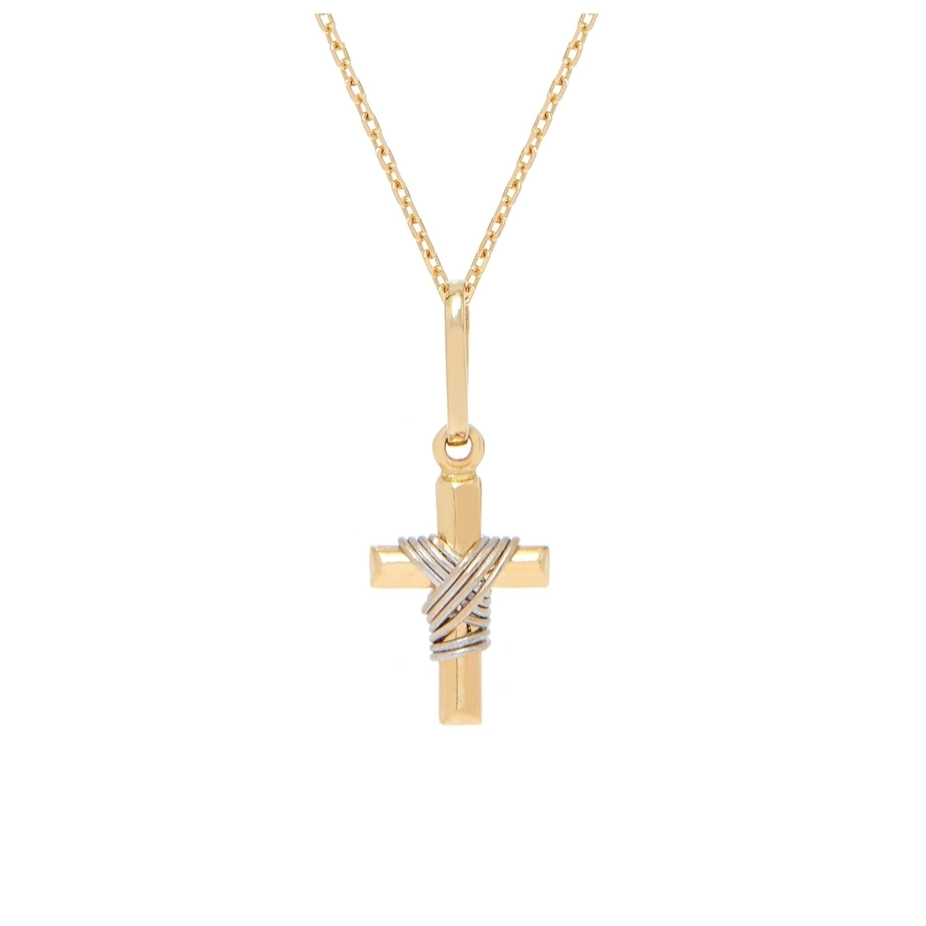 O pingente cruz nó é produzido em ouro amarelo e branco 18k, mede aproximadamente 13 x 8 mm (sem considerar o elo).
