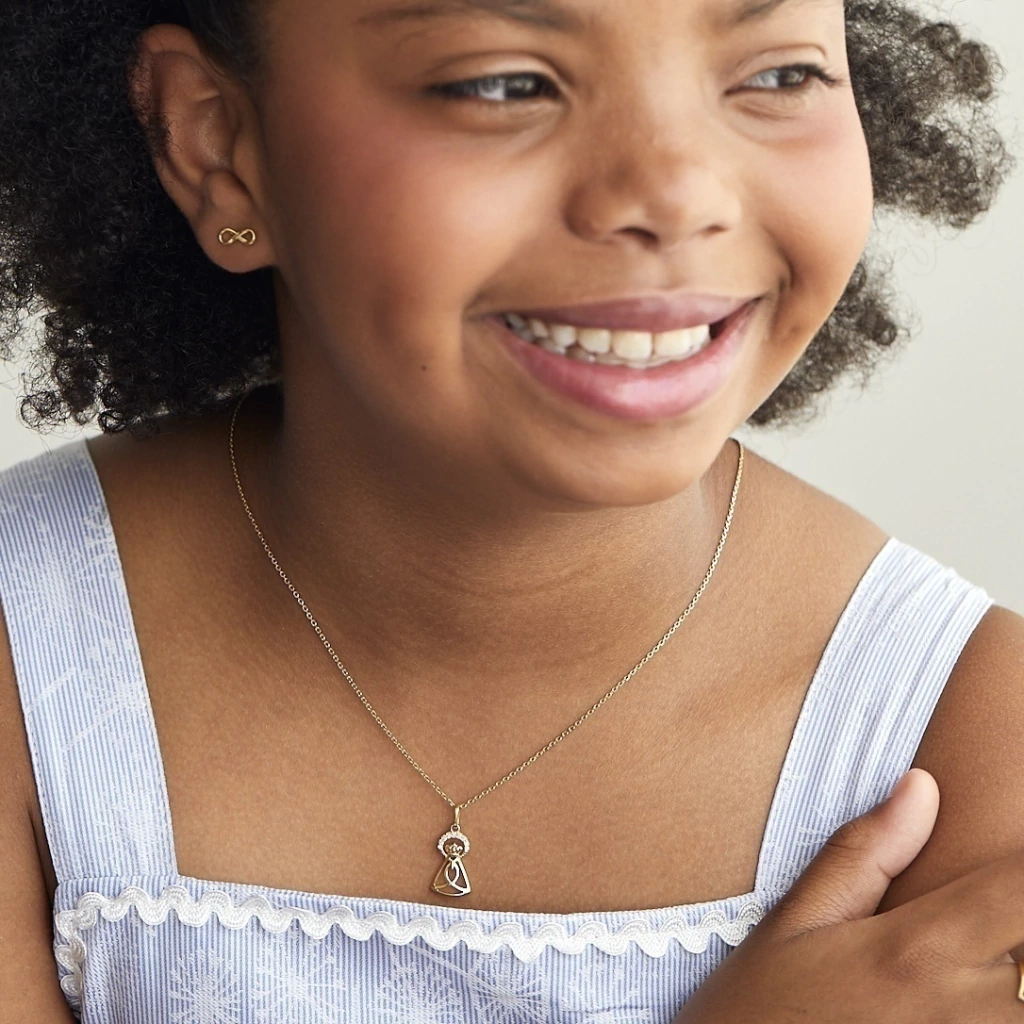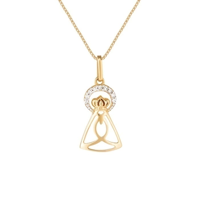 O pingente Nossa Senhora Aparecida é produzido em ouro amarelo 18k, mede aproximadamente 16 x 9 mm (sem considerar o elo) e possui 9 diamantes.