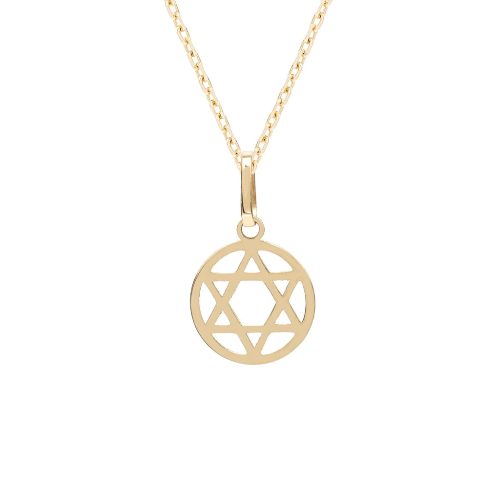 O pingente estrela de Davi é produzido em ouro amarelo 18k, mede aproximadamente 10 mm de diâmetro (sem considerar o elo).