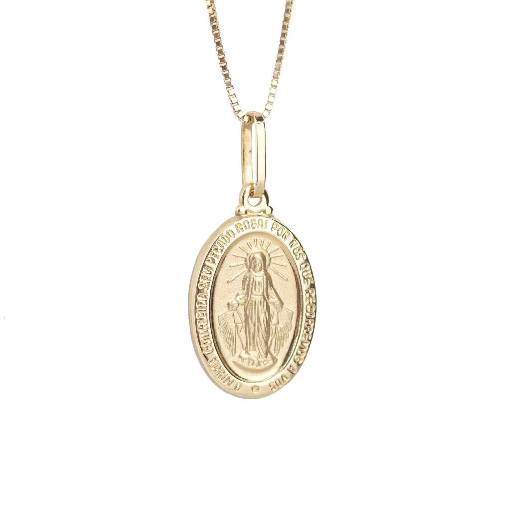 O pingente Nossa Senhora Graças (Nossa Senhora Milagrosa) é produzido em ouro amarelo 18k, mede aproximadamente 16 x 10 mm (sem considerar o elo).