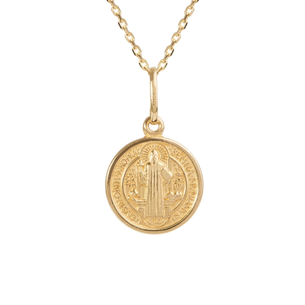O pingente São Bento é produzido em ouro amarelo 18k, mede aproximadamente 13 mm (sem contar com o elo).