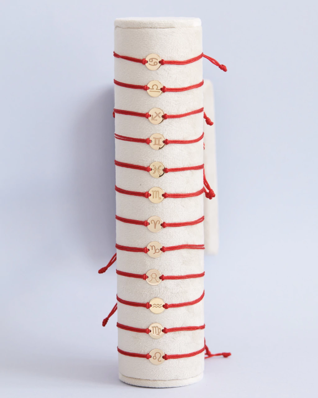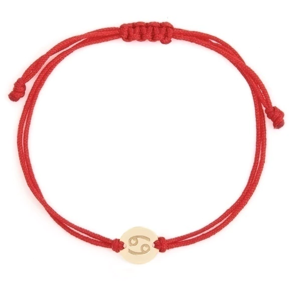 A pulseira signo de Câncer é produzida em fio de poliéster vermelho* e o pingente em ouro amarelo 18k. O pingente mede aproximadamente 10mm.
