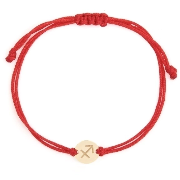 A pulseira signo de Sagitário é produzida em fio de poliéster vermelho* e o pingente em ouro amarelo 18k. O pingente mede aproximadamente 10mm.