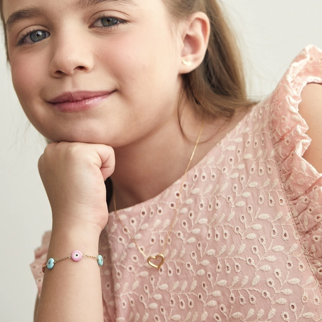 A pulseira olho grego é produzido em ouro amarelo 18k, mede aproximadamente 15cm e possui 5 pedras coloridas de olho grego em resina com 8mm cada.